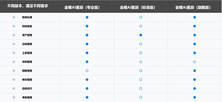 金蝶AI星辰各版本功能对比